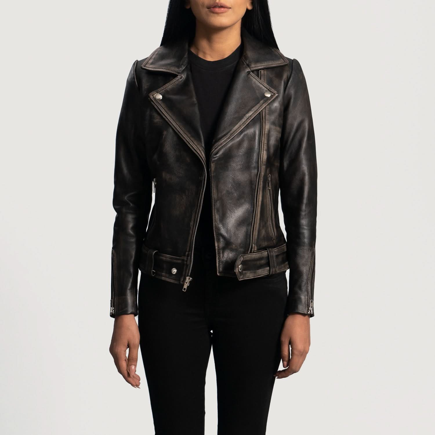 Rumy Distressed Brown Leather Biker Jacket