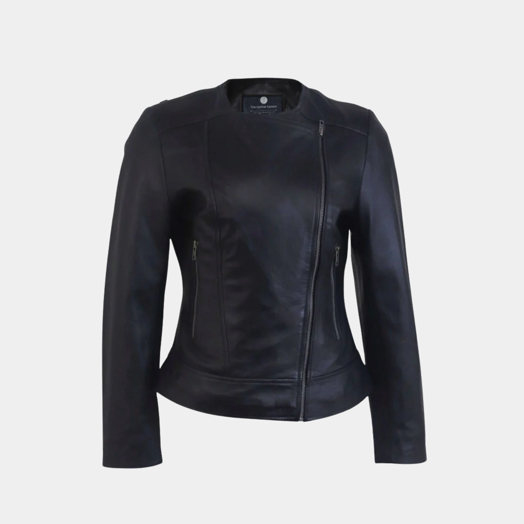 The Women’s Round Necked Black Leather Jacket is a timeless wardrobe staple that seamlessly blends style and functionality. Crafted from premium black leather, this jacket features a chic round neck design that adds a contemporary twist to a classic silhouette. Ideal for layering over both casual and dressy outfits, it’s the perfect choice for any occasion, providing warmth and style in equal measure.