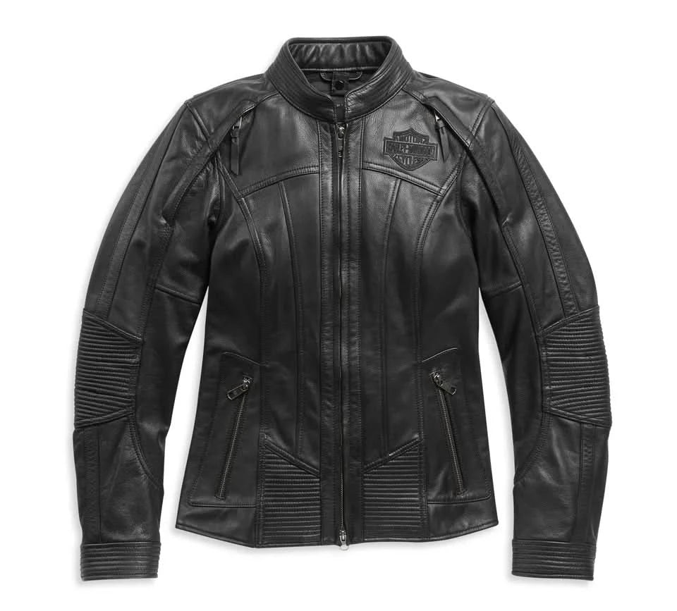 Road-trip ready and refined, the Willie G™ Auroral Leather Jacket delivers a tapered fit with versatile comfort. Featuring a removable windproof fleece, cooling vents, and armor-ready construction, it keeps long rides comfortable. Enhanced graphics and reflective detailing boost visibility, while secure storage and durable leather make it a dependable women’s riding essential.